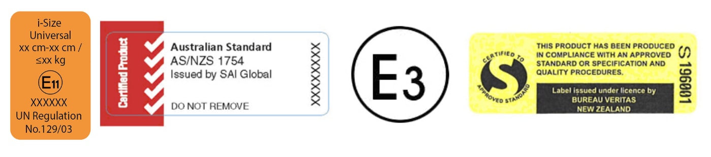 • Ensure the car restraint meets New Zealand Standards, it must display one of the following labels.