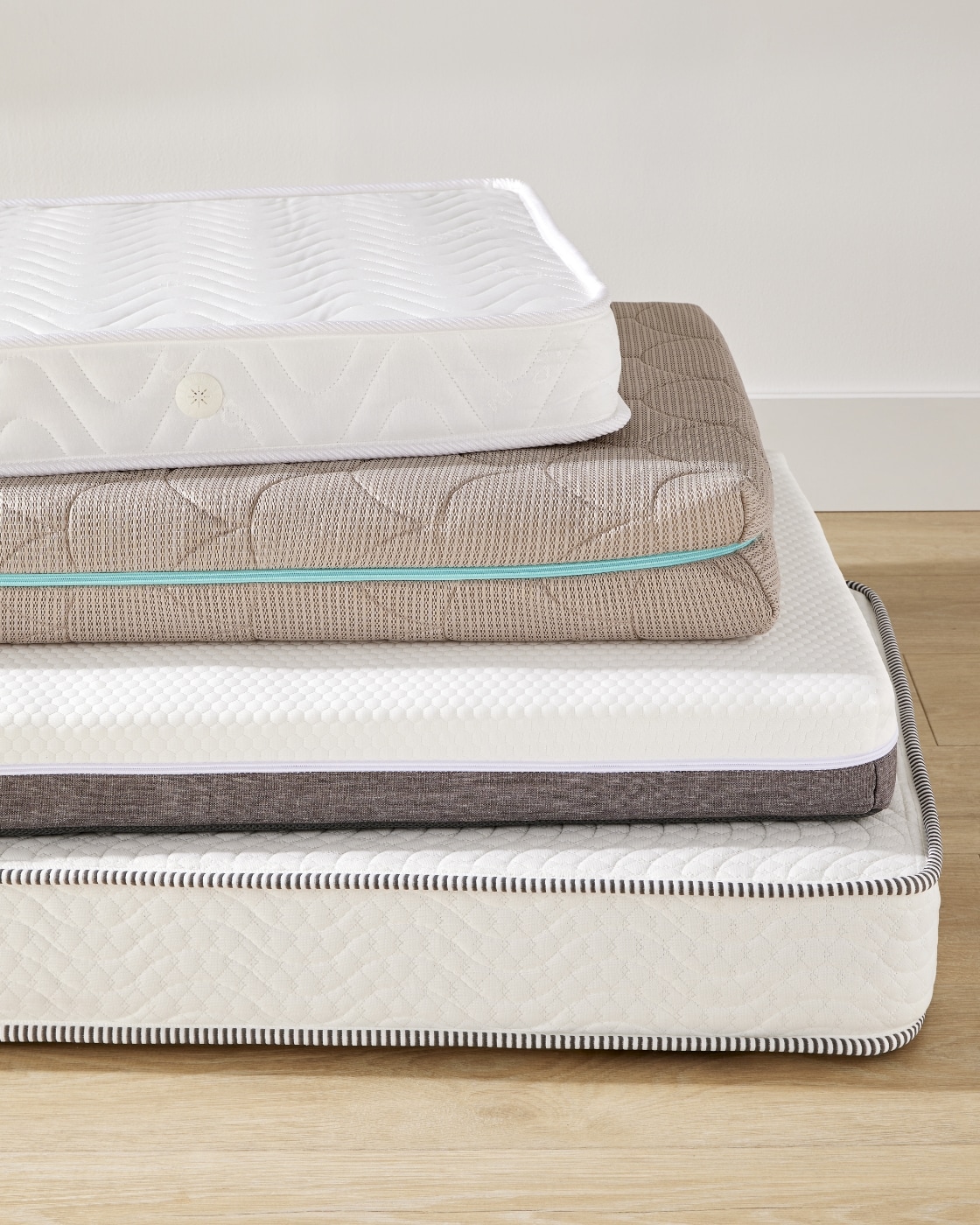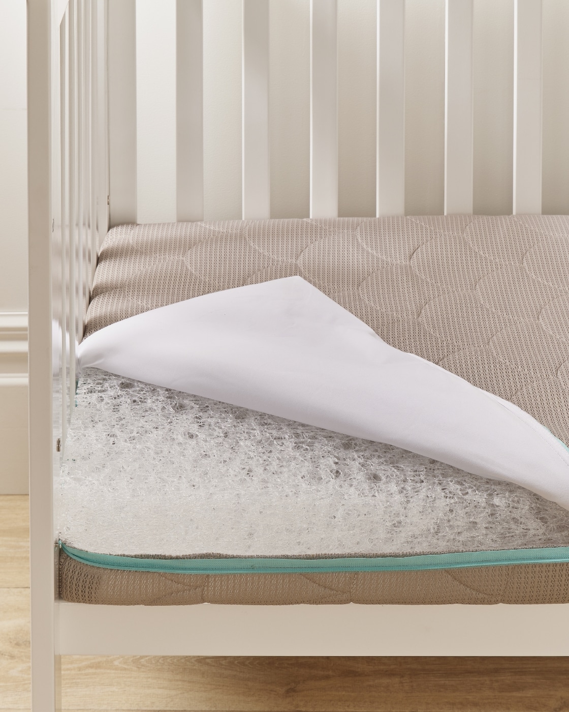 A cot mattress should be firm and flat with a thickness between 100 to 150mm. A mattress that is too soft may cause suffocation or Sudden Unexpected Death of an Infant (SUDI) risk. You can test by pressing in the centre and the edges of the mattress. You should feel some resistance and the surface should spring back immediately.
