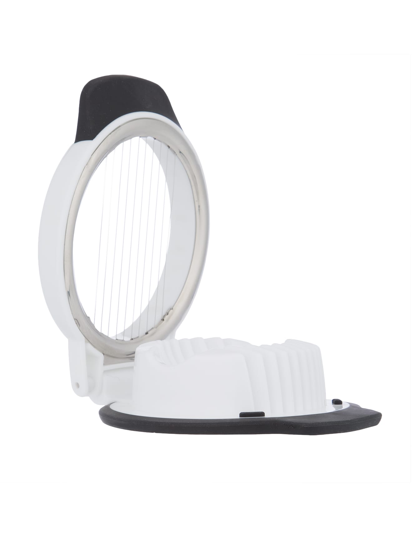 The Oxo Good Grips egg slicer is a simple solution for quickly and easily slicing hard-boiled eggs. This no-fuss slicer yields perfect 5mm slices with one simple press. The egg slicer has a holder that cradles the egg in two directions, giving you the option of round or oblong slices. The raised handle is easy to open and close, and the non-slip base provides a comfortable grip while slicing over bowls or plates.