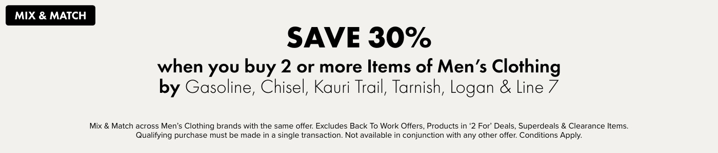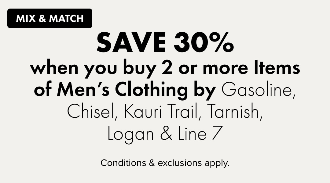 Discover trusted men’s fashion brands including Levi’s, Jack & Jones, Canterbury, Puma, Jockey, Chisel, Gasoline, Kauri Trail, Tarnish and more - with styles that span from casual denim to sportswear and smart casual looks.