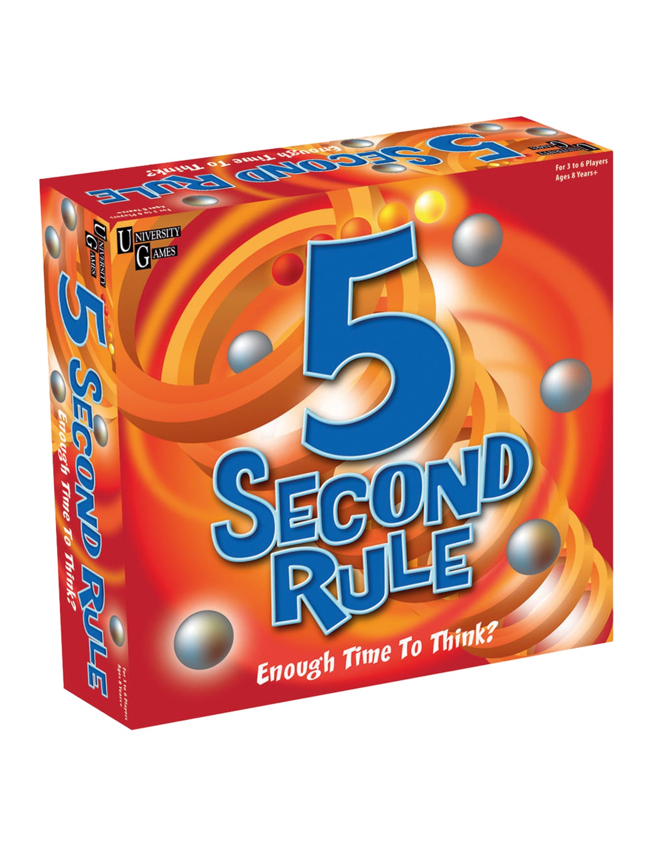 Time is not on your side with the 5 Second Rule board game! It should be easy to name three breeds of dogs - but can you do it under the pressure of five seconds? Includes: 576 questions on 288 cards, playing board with six playing pawns, five second twisted marble timer, and rules card.
